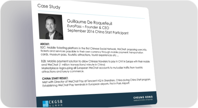Case Study Guillaume De Roquefeuil EuroPass – Founder & CEO September 2016 China Start Participant ABOUT: B2C: Mobile ticketing platform in the first Chinese Social Network, WeChat: proposing users info, tickets and services payable in their own currency through mobile payment: transportation cards, museum pass, touristic attractions, tourist experiences etc ... B2B: Mobile payment solution to allow Chinese travelers to pay in CNY in Europe with their mobile and WeChat (1 million transactions/ minute in China) Marketplace regrouping all European WeChat accounts to mutualize traffic from touristic attractions and luxury commerce. CHINA START RESULT: Met with Director of WeChat Pay at Tencent HQ in Shenzhen, China during China Start program. Establishing WeChat Pay terminals in European airports. First in Paris Airport! Your Company Name Presentation page