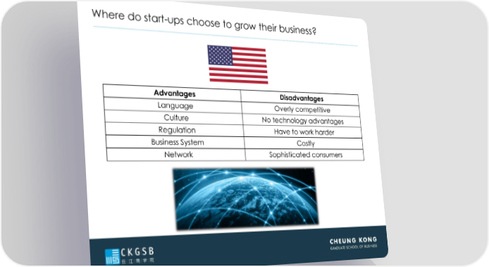 Where do start-ups choose to grow their business? Advantages Disadvantages Language Overly competitive Culture No technology advantages Regulation Have to work harder Business System Costly Network Sophisticated consumers Your Company Name Presentation page