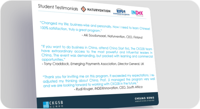 Student Testimonials “Changed my life; business-wise and personally. Now I need to learn Chinese! 100% satisfaction, truly a great program.” - Aki Soudunsaari, Naturvention, CEO, Finland “If you want to do business in China, attend China Start first. The CKGSB team have extraordinary access to the most powerful and influential leaders in China. The event was demanding, but packed with learning and commercial opportunities.” - Tony Craddock, Emerging Payments Association, Director General, UK “Thank you for inviting me on this program. It exceeded my expectations. I re- adjusted my thinking about China. Prof. Ji managed the program very well and we are looking forward to working with CKGSB in the future.” - Rudi Kruger, iNDEXInnovation, CEO, South Africa Your Company Name Presentation page
