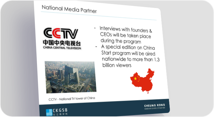 National Media Partner - Interviews with founders & CEOs will be taken place during the program - A special edition on China Start program will be aired nationwide to more than 1.3 billion viewers CCTV - National TV tower of China Your Company Name Presentation page