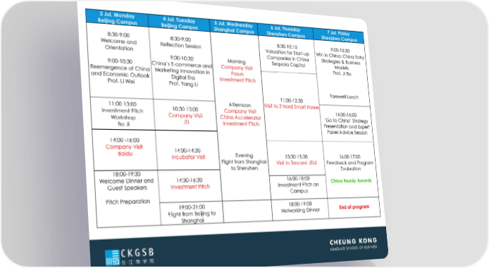 3 Jul, Monday 4 Jul, Tuesday 5 Jul, Wednesday 6 Jul, Thursday 7 Jul, Friday Beijing Campus Beijing Campus Shanghai Campus Shenzhen Campus Shenzhen Campus 8:30-9:00 8:30-9:00 8:30-10:15 9:00-10:30 Welcome and Reflection Session Valuation for Start-up Win in China: China Entry Orientation Companies in China Strategies & Business 9:00-10:30 Morning Sequoia Capital Models 9:00-10:30 China’s E-commerce and Company Visit Prof. JI Bo Reemergence of China Marketing Innovation in Fosun and Economic Outlook Digital Era Investment Pitch Prof. Li Wei Prof. Yang Li Farewell Lunch 11:00-12:30 11:00-13:00 Afternoon Visit to 3 Nord Smart Home Investment Pitch 10:30-13:00 Company Visit 14:00-16:00 Company Visit China Accelerator Workshop JD ‘Go to China’ Strategy Bo Ji Investment Pitch Presentation and Expert Panel Advice Session 14:00 -16:00 Company Visit Baidu 14:00-14:30 Incubator Visit Evening 13:30-15:30 16:00-17:00 Flight from Shanghai Visit to Tencent /DJI Feedback and Program 18:00-19:30 to Shenzhen Evaluation Welcome Dinner and 14:30-16:30 16:00-18:00 Guest Speakers Investment Pitch Investment Pitch on China Ready Awards Campus Pitch Preparation 19:00-21:00 18:00-19:00 End of program Flight from Beijing to Networking Dinner Shanghai Your Company Name Presentation page